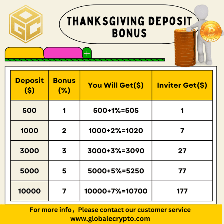 Thanksgiving Rewards Event (November 20, 2023, to November 30, 2023): This event offers tiered recharge rewards and referral gifts, enhancing the benefits of participating in GlobaleCrypto’s services.