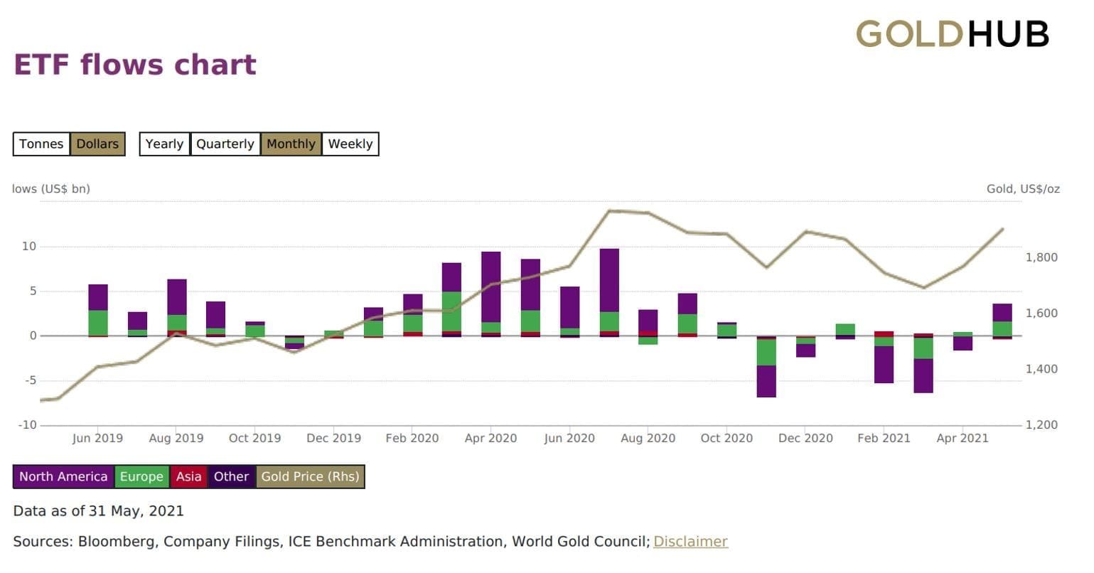 Fund movement was mostly negative in physical gold exchange-traded funds (ETFs) from October 2020 to April 2021. However, that scenario changed when capital inflows for gold ETFs flipped positive back again in May. According to the World Gold Council (WGC) data, global yellow metal ETFs attracted a combined total of $3.4 billion. This was a significant improvement since September last year.