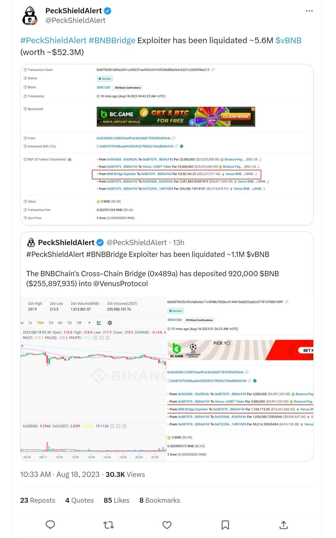 LUCKNOW (CoinChapter.com) – BNB hacker involved in the theft of nearly $600 million last year has lost funds of $60 million in collateral on the Venus Protocol’s borrowing and lending platform. Security firm PeckShield was the first to report the extensive collateral liquidation.