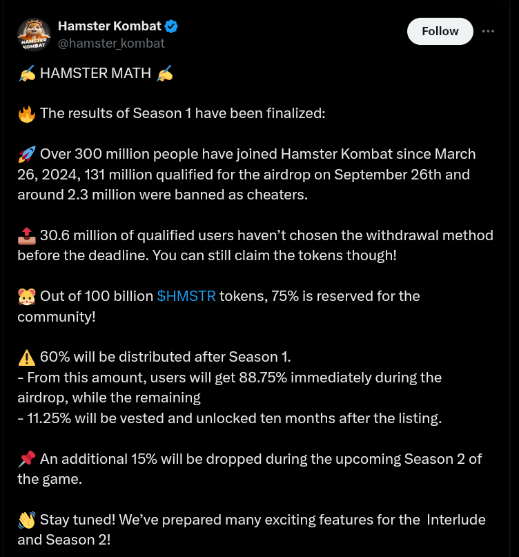 Hamster Kombat’s announcement also clarified the final eligibility for the airdrop. Out of the 300 million players, only 129 million remain eligible for the token distribution. Initially, 131 million players qualified, but 2.3 million were later disqualified due to violations of the game’s rules, primarily involving cheating.