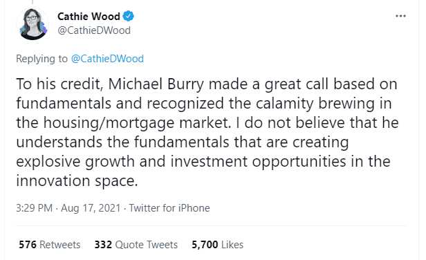 “Antie Wood” lost no time to respond to Mr. Burry on Twitter, questioning his competence in the fintech field, albeit recognizing his merits.