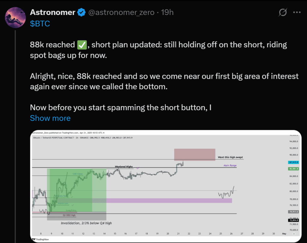 One trader, known as Astronomer, noted that BTC had reached a key level of interest near $88,000. The trader confirmed in a reply to their tweet that they are holding spot positions and are not yet shorting, suggesting the market has not given a clear reversal cue.