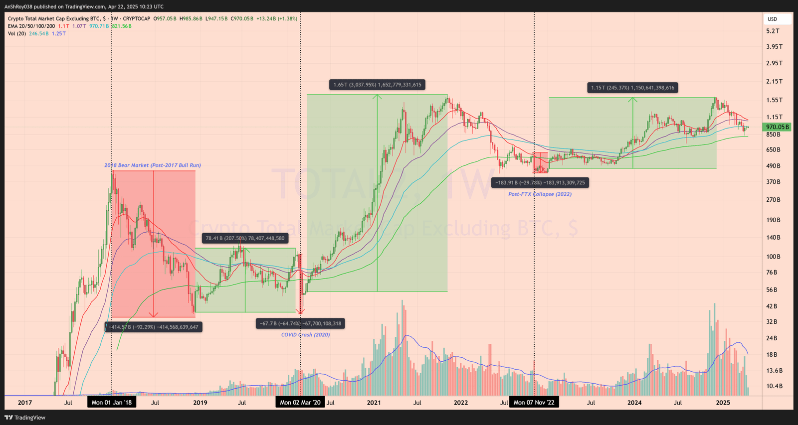 The COVID crash added to the chaos. Total 2 fell by nearly 65% in days, dragging most altcoins down. Yet what followed was a historic rebound. Between April 2020 and November 2021, the altcoin sector posted gains exceeding 3,000%, pushing the Total 2 to $1.65 trillion.