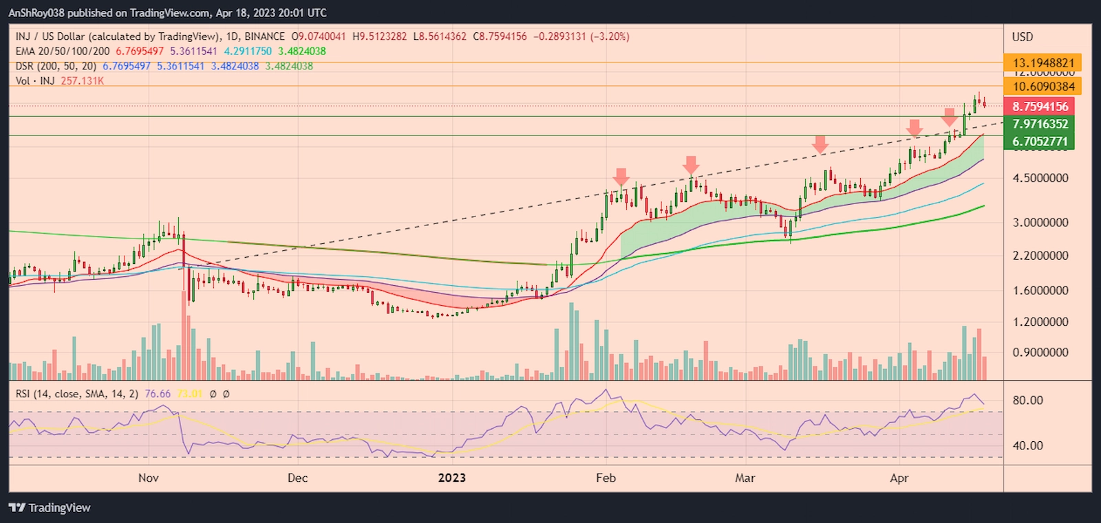 Interestingly, INJ Price reacted in a textbook manner to overbought RSI levels. Moreover, if the downtrend continues, the INJ token price might drop to support near $7.97.