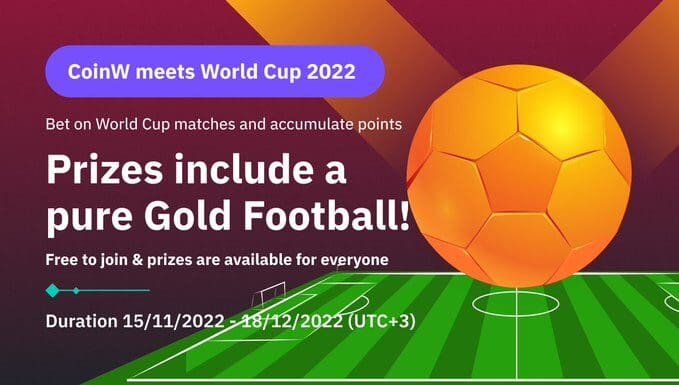 CoinW’s World Cup Contest is still ongoing. All CoinW users will receive 1 free bid per day, users can also gain additional bids by referring friends and depositing onto the exchange to bid on 64 matches for free. After the contest ends, rewards will be given out based on individual score tallies, the higher the score, the bigger the prize. The grand prize of 300g Golden Footballs, treadmills and other luxury items are all up for grabs. Click here to participate now: https://www.coinw.com/page/worldcup/
