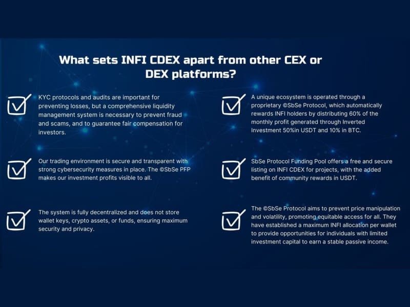 One of the appealing features of INFI CDEX is its opportunity for other projects to list without any charge. This gives these projects a means to earn USDT passive income for their communities thanks to the ©SbSe Protocol.