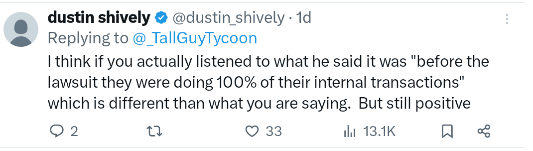 One user dismissed the claim outright, calling it a “lie.” Another provided context, stating that the CEO may have referred to Bank of America’s past usage of XRP, mentioning that the bank used XRP for 100% of its internal transactions “before the lawsuit.”