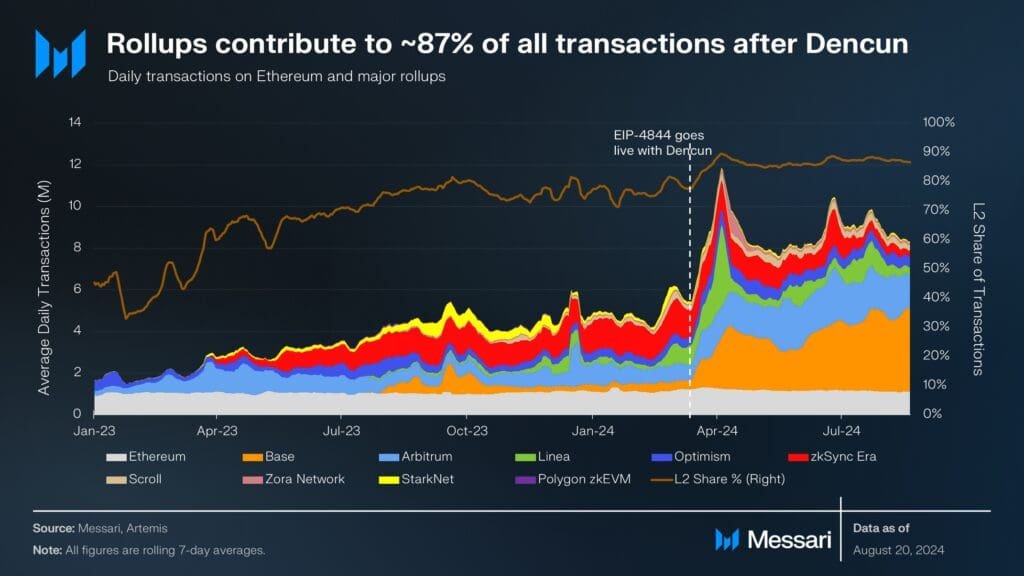 This strategy has shown positive results, with rollups now accounting for 87% of daily Ether transactions, which is more than six times that of the Ethereum mainnet.