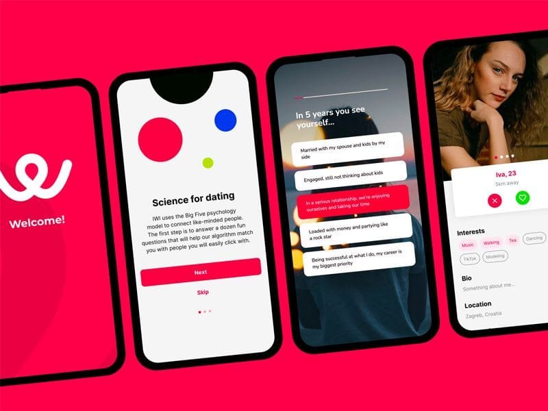 The IWI app is an AI-powered psychology-based dating app aiming to connect people based on their personalities. The process starts with a Big Five personality questionnaire. Next, the algorithm uses AI to help assess a person’s profile and find suitable matches. Finally, the algorithm provides a tailored list of recommendations for the user.