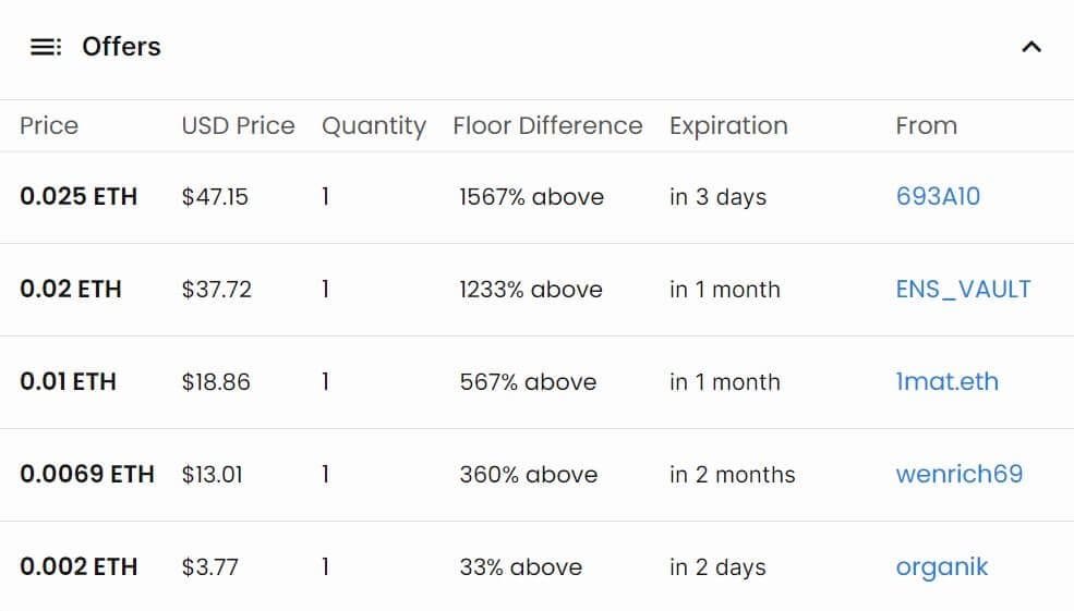 Over the year, the price valuation declined even more sharply. The next highest bid was only $280 in April 2023. And now, the highest bid is even lower.