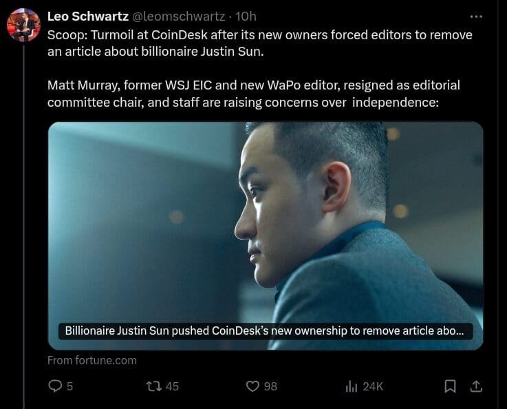 Soon after its publication, sources reported that Sun’s team complained about the article’s tone, which they felt was too critical. Following these complaints, CoinDesk’s new owners, the crypto exchange Bullish, allegedly demanded to remove the article. Bullish, which is closely tied to Sun’s Tron blockchain, is a major sponsor of CoinDesk’s flagship Consensus conference series. Although the article was taken down from CoinDesk’s website, a version still remains available via Yahoo News due to syndication.