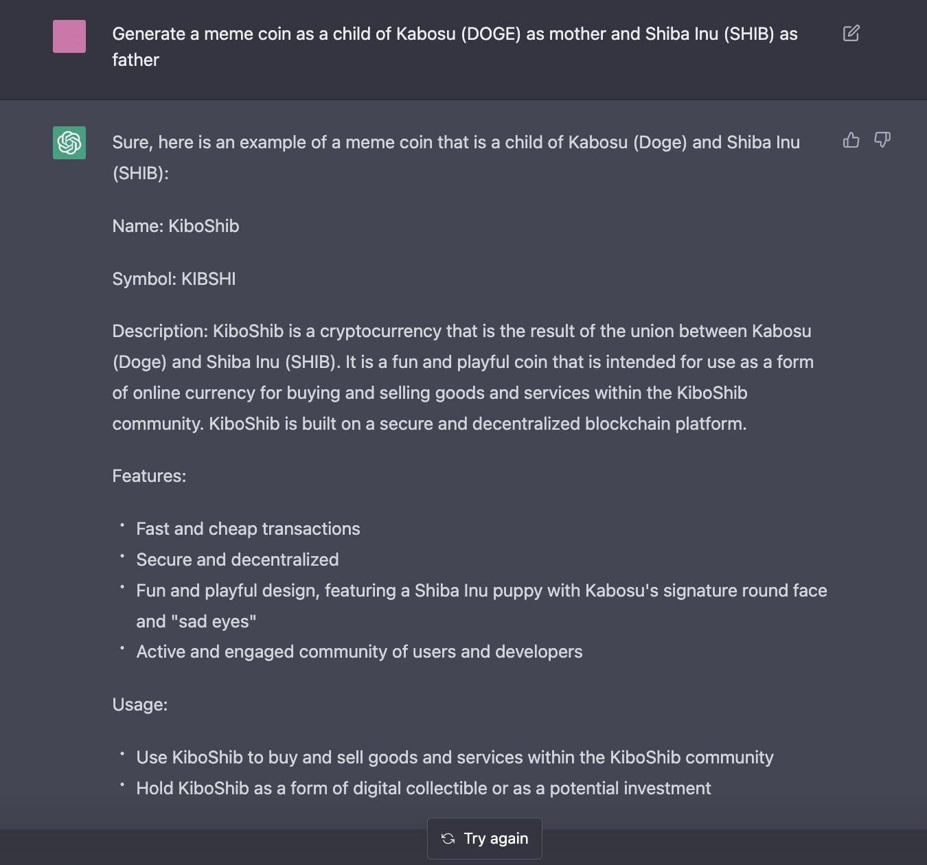 “Sure, here is an example of a meme coin that is a child of Kabosu (Doge) and Shiba Inu (SHIB):