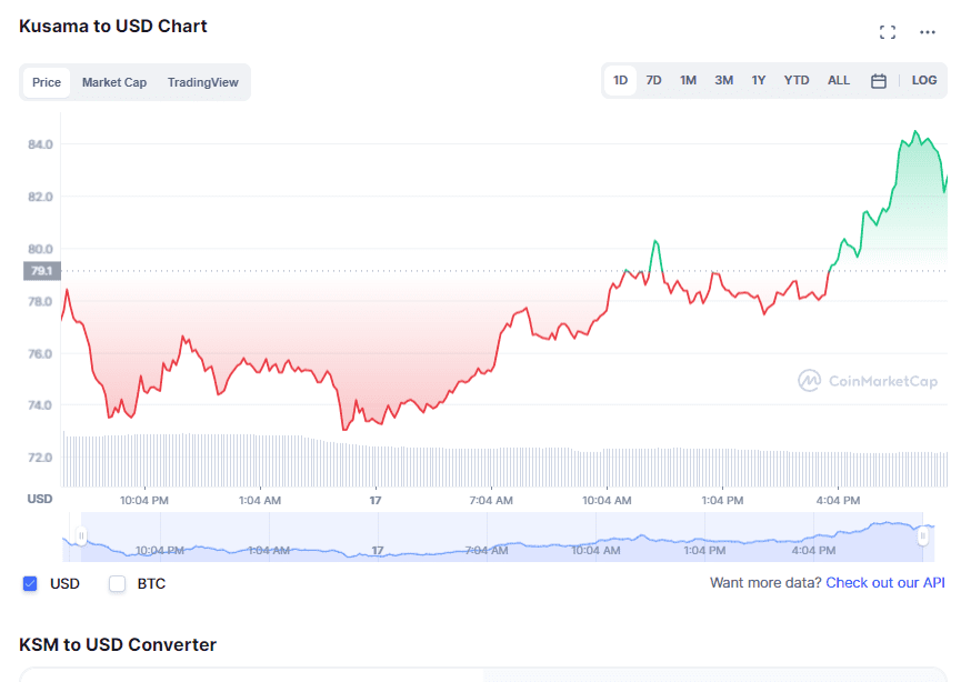 YEREVAN (CoinChapter.com) – Kusama, the “canary network” for the Polkadot blockchain, saw its in-house token KSM gain 14.5% of value in the previous 24 hours. As a result, the digital asset traded at nearly $80 in Tuesday’s European session.