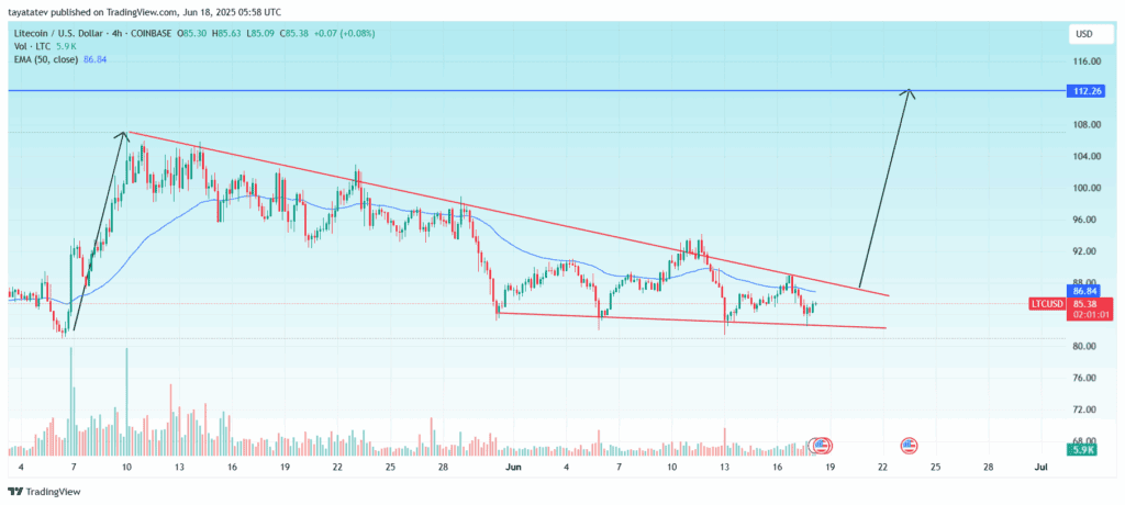 The chart covers activity from 2012 to mid-2025. After peaking in late 2017, Litecoin entered a long consolidation phase. Between 2018 and 2024, LTC formed higher lows and lower highs inside a symmetrical triangle. In 2025, the candles touch the triangle’s upper resistance, signaling a potential breakout.