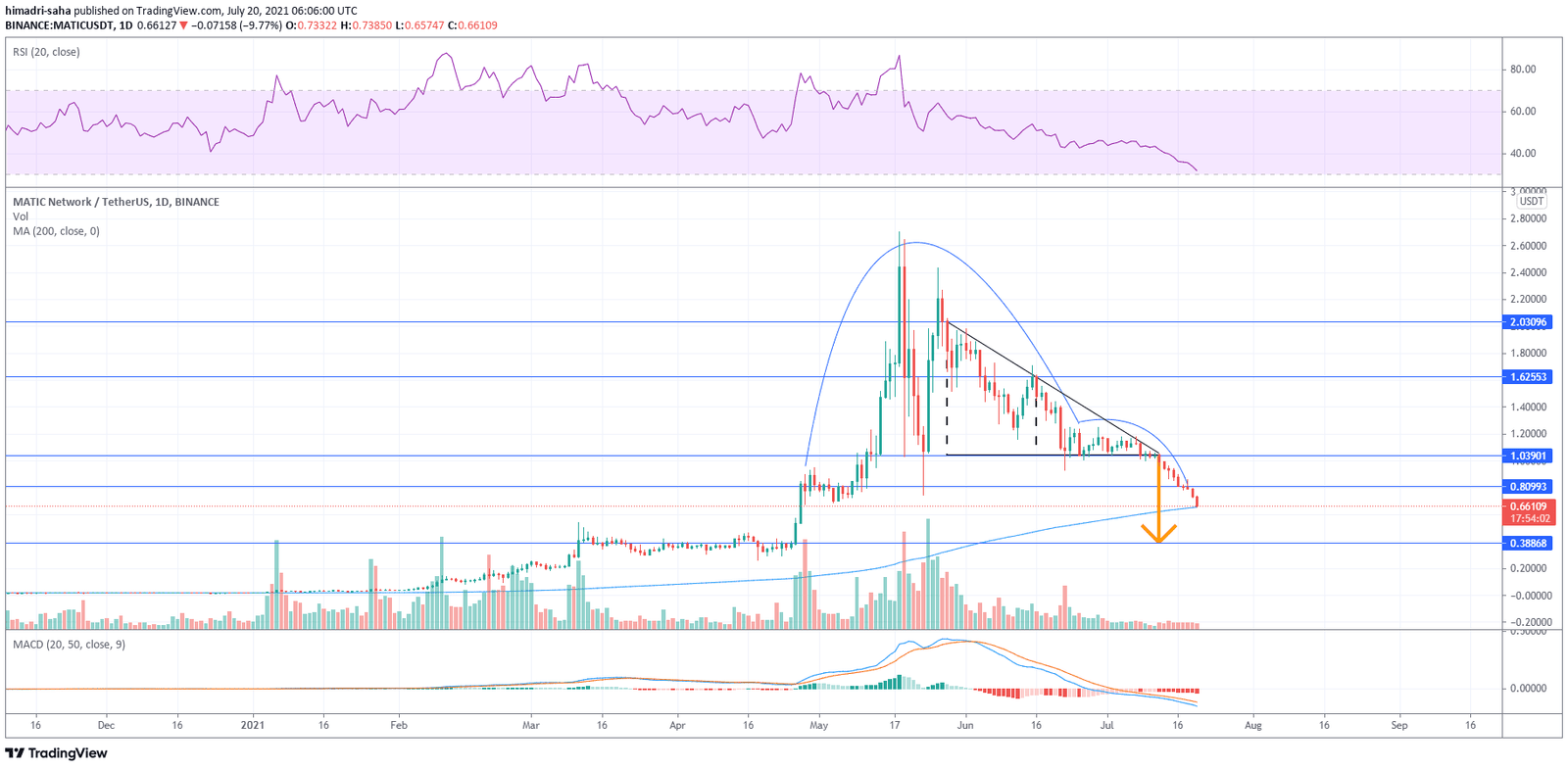 In the week spanning July 12 – July 18, MATIC corrected downwards by 23% from $1.05 to $0.81. After yesterday’s selling rout, the crypto asset has lost another 17% and fell below $0.67. It remains supported above the 200-day moving average (MA), but sell orders are piling up, indicating that another round of correction is round the corner.