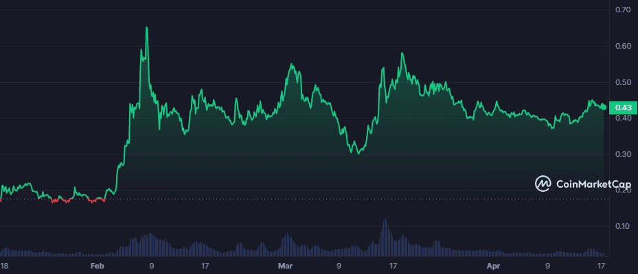SingularityNET is a decentralized AI network that allows anyone to create, share, and monetize AI services. The platform has many applications, from healthcare to finance, and is already being used by some leading companies. The price of SingularityNET has been steadily trading in a channel between $0.30 and $0.43 in the past three months and is expected to reach new heights in the next bull run.