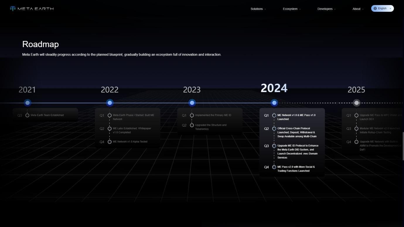 In summary, the official launch of the ME website marks Meta Earth’s formal entry into a phase of rapid iteration and growth. We firmly believe that, with the joint efforts of ME Labs and the global community, ME Network will become a leading modular public chain in the data sovereignty field, providing Web3 with high-performance, compliant, privacy-protective, and multi-chain interactive infrastructure. It aims to introduce trillion-level traditional industry application scenarios, promoting the comprehensive prosperity of the digital encryption era.