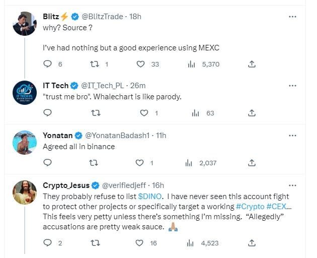 Additionally, several users replied to @WhaleChart, saying they did not have any negative experience with MEXC and that the allegations were unfounded.
