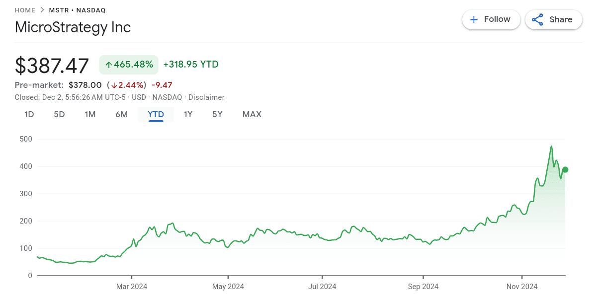 Bitcoin price surged by 120% this year, reaching an all-time high of $98,739. In November, MicroStrategy’s Bitcoin holdings increased in value to $37.6 billion, up from an initial investment of $21.9 billion. This growth has also positively impacted MicroStrategy’s stock, which has soared by 465% in 2024, reaching a new peak in November.