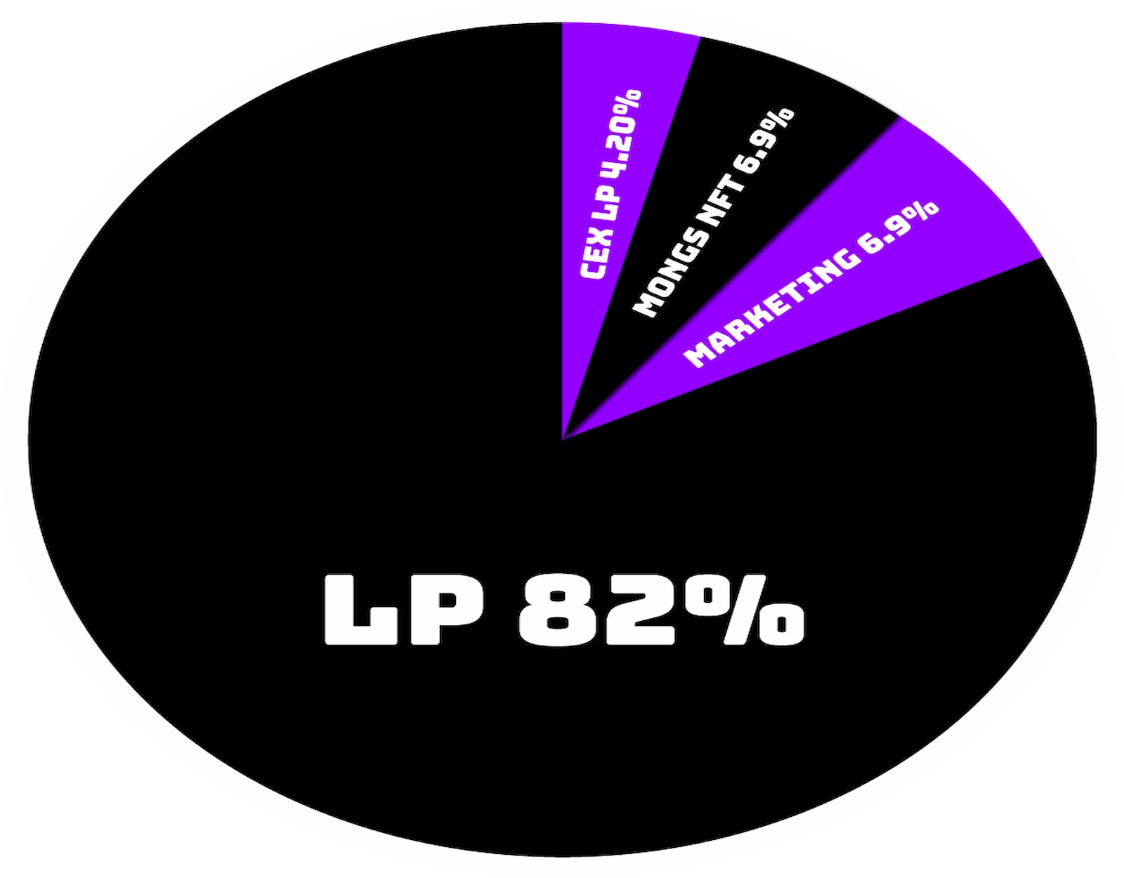 Per the MongCoin team, 82% of the total MONG tokens would be set aside for liquidity pools (LP), and 4.2% would reach the centralized exchange’s Ps. Additionally, the team would distribute 6.9% of the total token supply to MONG NFT holders, which went live in Jan this year.
