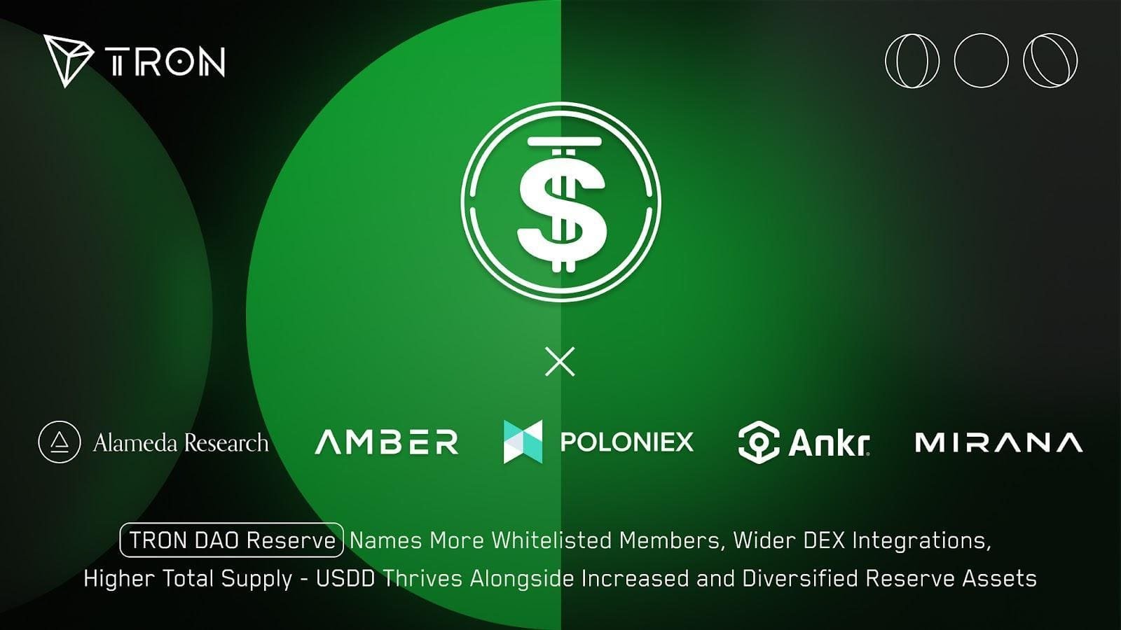 he TRON DAO Reserve has announced four more major players in the blockchain industry, Amber Group, Poloniex, ANKR, and Mirana following Alameda Research founded by Sam Bankman-Fried as the second, third, fourth, and fifth Members and Whitelisted Institutions to mint Decentralized USD (USDD).