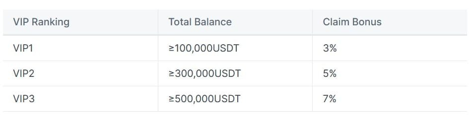 As given above, the VIP1 Rank user must have up to 100,000 USDT balance in their account. They can claim a bonus of 3% when they start staking. The claim bonus starts from 3% up to 7%.