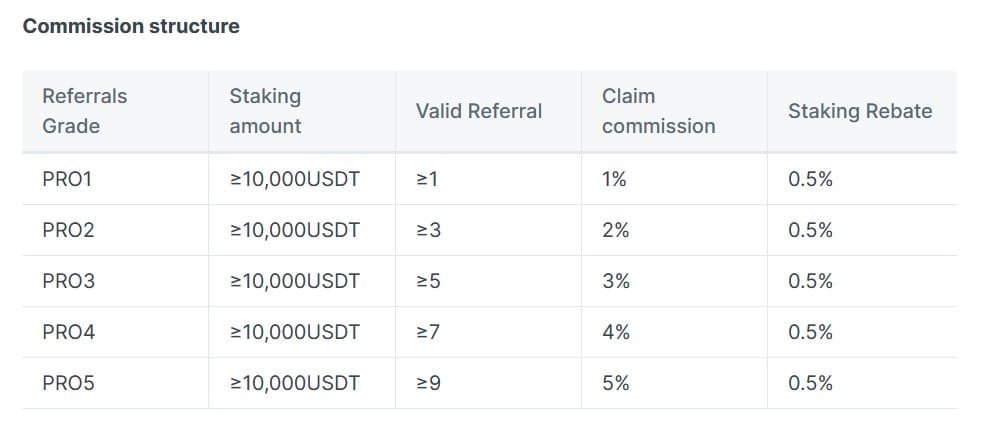 For instance, a user with a staking amount of up to 10,000 USDT and less than or equal to one valid referral will receive a 1 percent commission and 0.5% staking rebate and get the grade PRO1 referral grade.