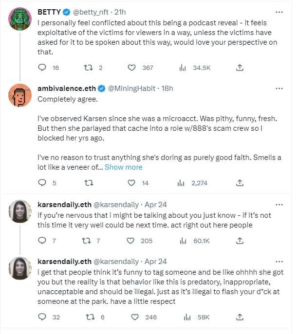 According to her latest tweet, Karsen intends to reveal a “prominent man” who not only founded a web3 company but also sent d*ck pics to “several people in the web3 community.” However, which part of the story is supposed to shock people is unclear.