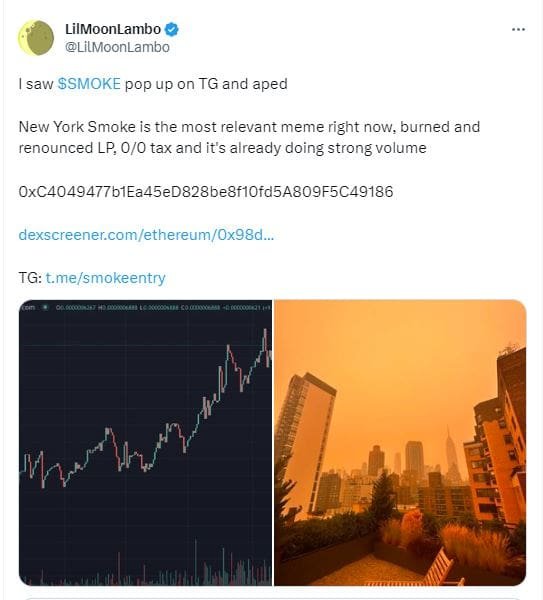 YEREVAN (CoinChapter.com) – Images of New York choking in smoke made headlines as residents struggle to deal with the repercussions of wildfires in Canada. However, the challenge didn’t stop crypto scammers from creating a new bait-coin SMOKE and pumping it 2,300% in an hour.