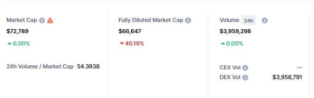 While the resulting market cap stood at $72,800 (unverified), the daily trading volume amounted to $3.9 million.