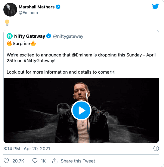 The artist, also known by his real name, Marshall Mathers, announced his NFT plans on social media. He will be releasing a one-time digital item on Sunday, April 25, through Nifty Gateway.