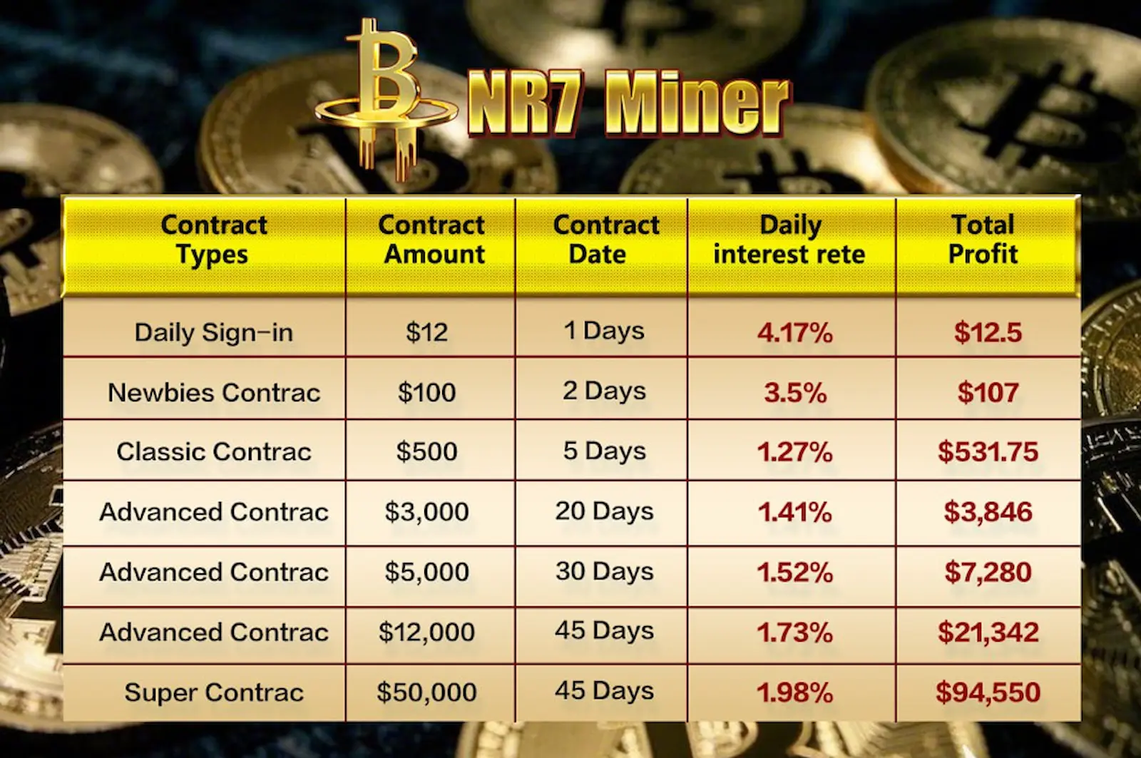 NR7 Miner provides users with a variety of ways to participate in mining investment and earn income. Whether they are novice or professional investors, they can find an investment plan that suits them. The following are the main ways to make money:
