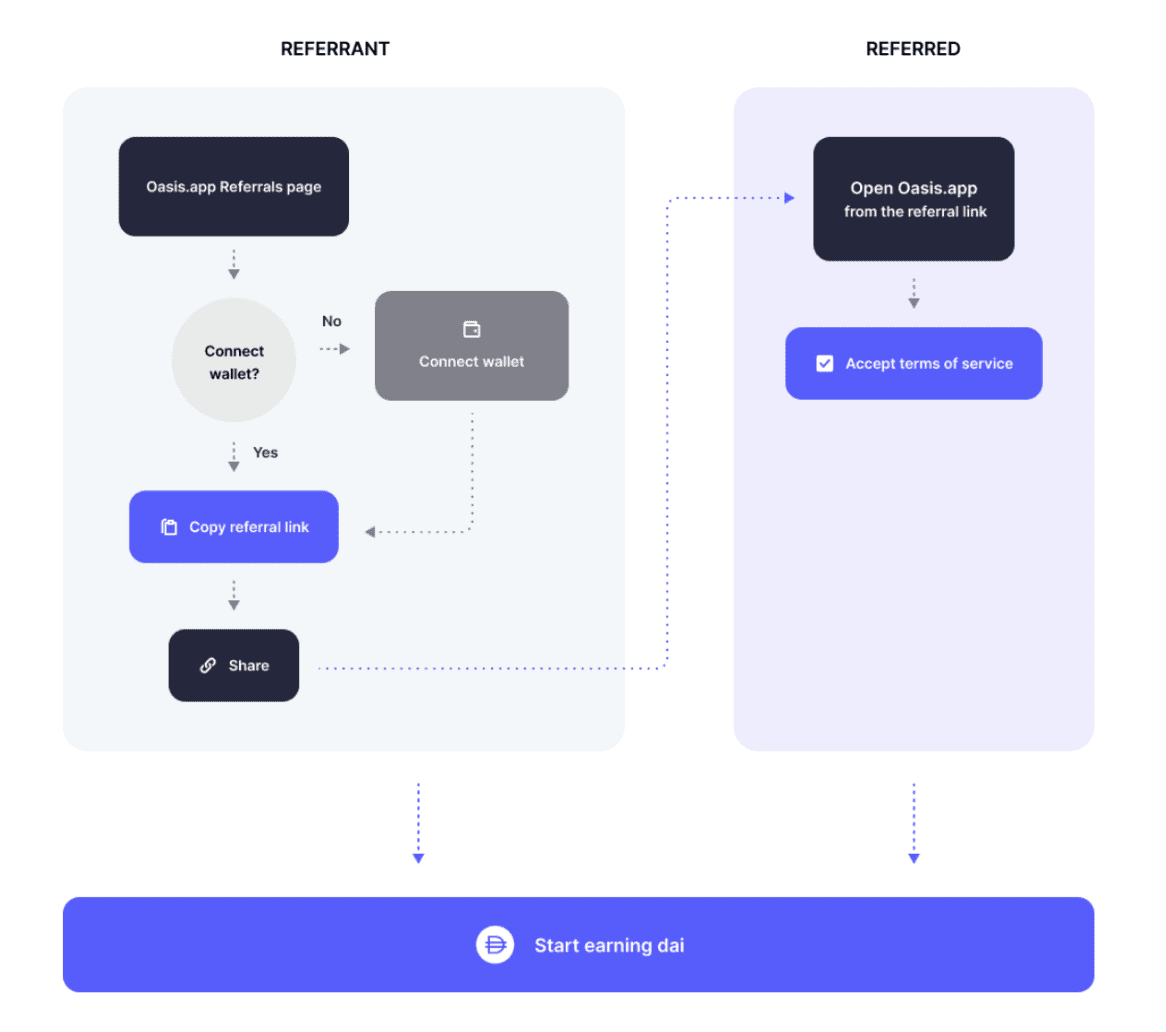 The referral process is simple. Users must head to the Oasis.app referral page and connect their wallet. From there, a user can generate a referral link and send it to a friend. The friend then connects their wallet and opts into the referral program. That’s it! From then onward, both parties will earn the aforementioned benefits.
