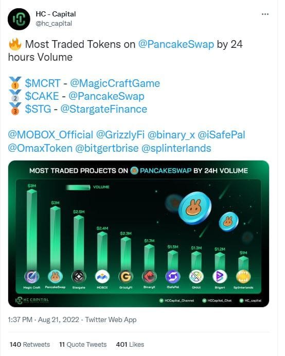 As a result, the token trended on social media and was the most traded digital asset on PencakeSwap by Aug. 21, outrunning the platform’s utility token.