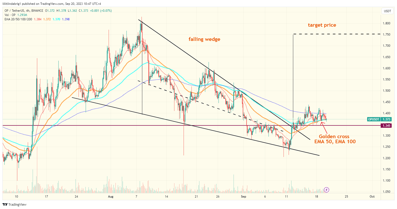YEREVAN (CoinChapter.com) – Optimism (OP) token price slid 1% in 24 hours and changed hands at $1.37 in the Asian-Pacific session on Sep 20, continuing the sideways consolidation for the previous three days. However, the token could rise 27% by 2024 due to bullish technicals.