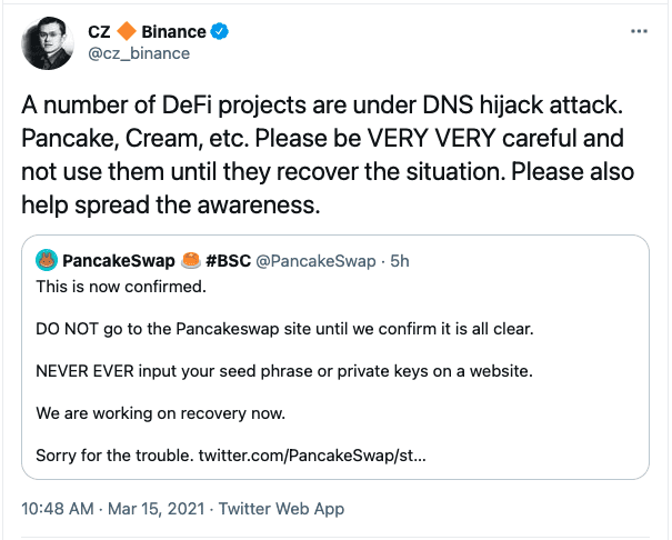 Binance CEO Changpeng Zhao asked traders to stay away from the breached protocols until the risk has been taken care of. “A number of DeFi projects are under DNS hijack attack,” Zhao said in a tweet. “Pancake, Cream, etc. Please be VERY VERY careful and not use them until they recover the situation. Please also help spread the awareness.”