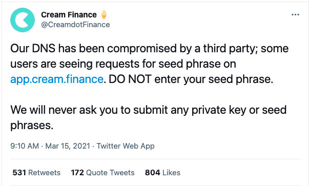 “Our DNS has been compromised by a third party; some users are seeing requests for seed phrase on http://app.cream.finance. DO NOT enter your seed phrase. We will never ask you to submit any private key or seed phrases.”