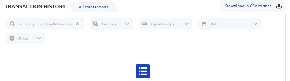 In this section, you can view all your transactions and search them by sum, ID, wallet address or by currency, operation type, date and status.