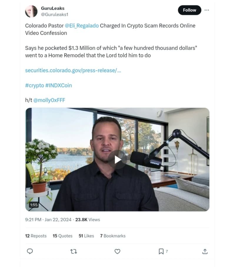 Regalado and his wife, Kaitlyn, launched a cryptocurrency called INDXcoin. They marketed it to members of Regalado’s Christian community. The couple promised investors that the currency was ordained to deliver impressive financial returns. However, according to authorities, INDXcoin was technically flawed and had no real value or liquidity, rendering investments in the coin worthless.