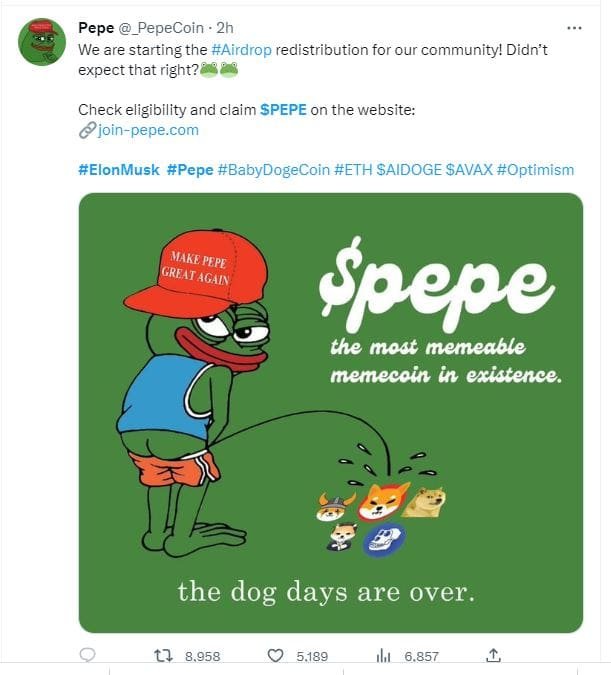 Meanwhile, the PEPE developers flooded Twitter with frog images that claimed to be more “memeable” than the canine meme coin family, including Dogecoin, Shiba Inu, and others, and saying, “The dog days are over.”