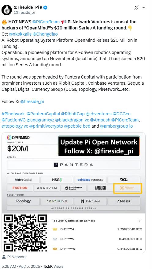 Pi Network Ventures has made its first major investment since launching its $100 million venture fund in May. The fund aims to support projects with real-world utility. The $20 million was allocated to OpenMind, a robotics startup founded by Stanford professor Jan Liphardt.