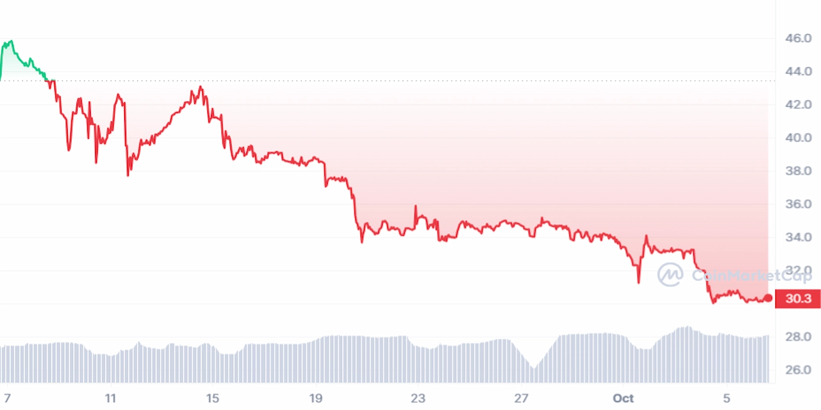 PI coin price spent the last ten days of September 2023 crabbing near the $34 price level.