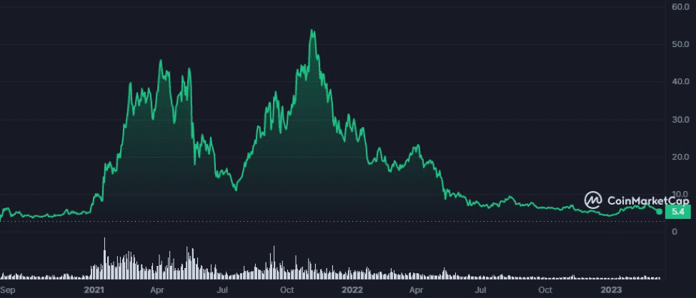 Polkadot (DOT) is currently the 12th biggest cryptocurrency and has been volatile since its launch. In August 2020, the price of DOT was around $2.50. However, the price increased rapidly; by November 2021, it had reached an all-time high of $55. However, the price is since decreased steadily and currently trading in a channel between $5.50 and $7.50.