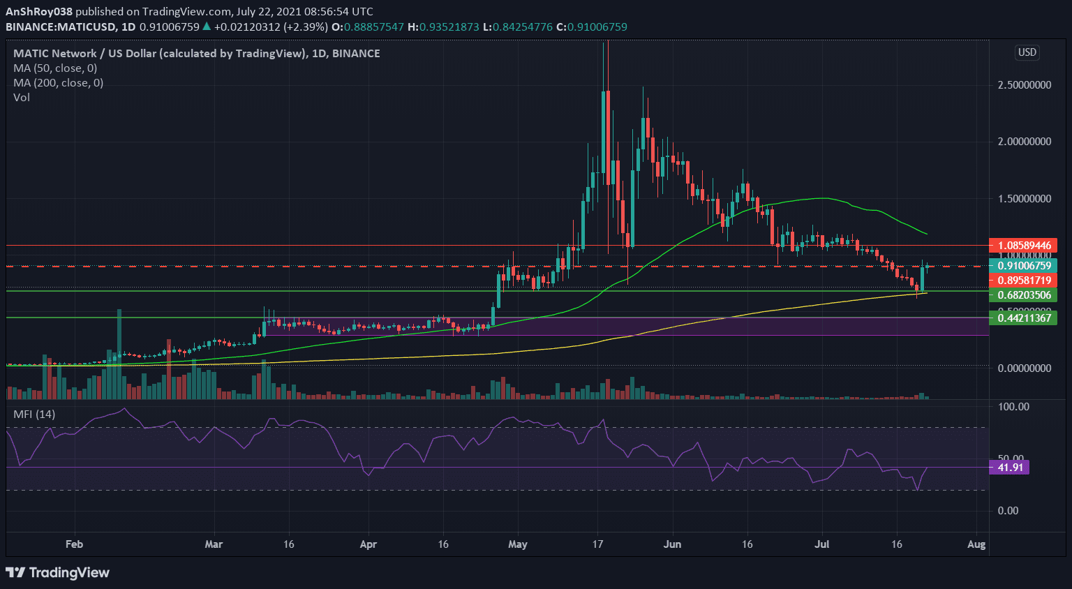 MATIC breached the crucial resistance of $0.9. Moreover, if bulls can consolidate at this price level, MATIC will likely reach the next resistance at $1.085. A move like that will mean a jump of 30% from the altcoin’s current prices. Support for the cryptocurrency is at $0.68.