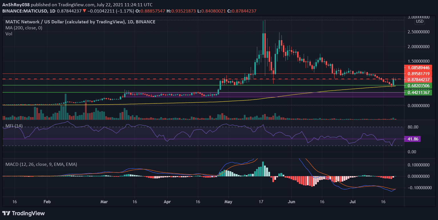 At the time of writing, MATIC/USD was trading at $0.8814, down by 0.81% into the day.