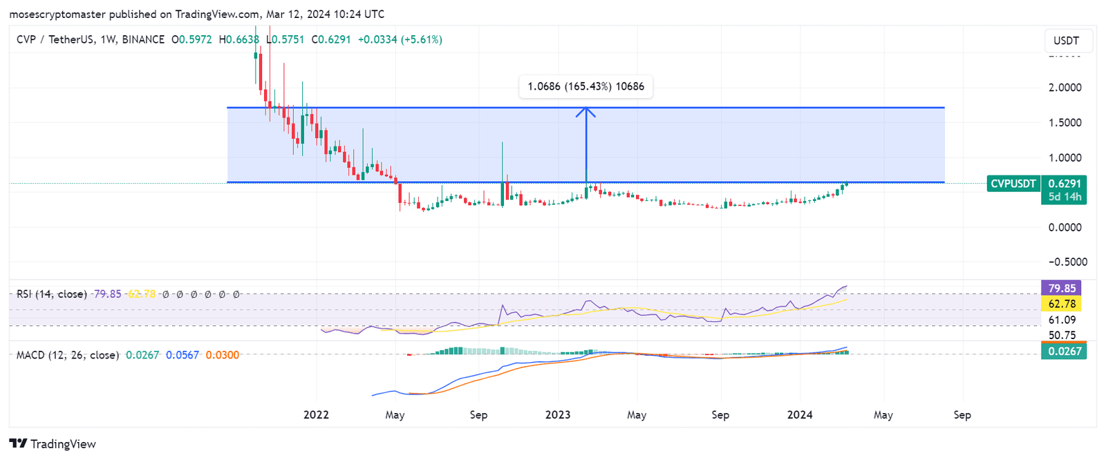 The Moving average convergence/divergence (MACD) confirms the positive market momentum for CVP /USD as it has crossed over the red signal line, indicating bulls are in control. Moreover, The Relative Strength Index (RSI) is currently at 79.85 in the overbought region, suggesting a solid bullish outlook for the CVP token.