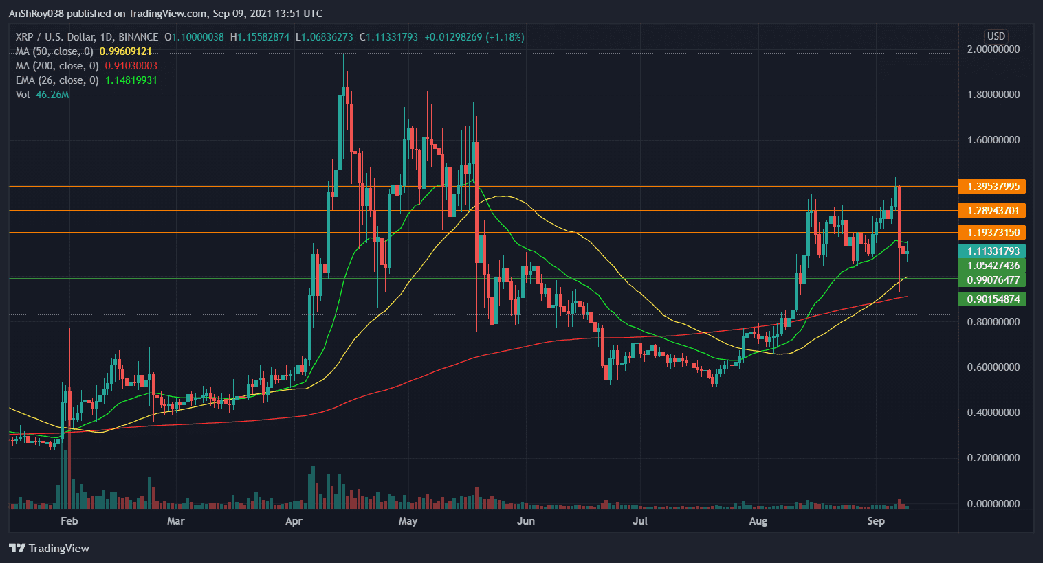 XRP’s 26-Day (Green) Exponential Moving Average now acts as a dynamic resistance. However, the ripple token is bullish, as its prices trade above the 50-Day (Yellow) and 200-Day (Red) MA trendlines. If the XRP’s fall continues, it will find support near $1.05.