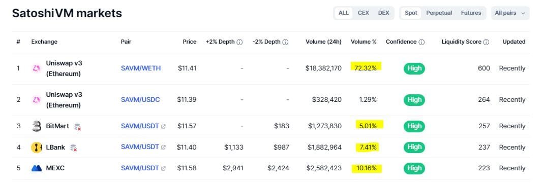 According to CoinMarketCap, 72% of the SAVM trading occurred on Uniswap (a decrease from the initial 99%) against wrapped Ethereum (WETH). The SatoshiVM pair with Tether (USDT) took place on MEXC with only 10% of the trading, and LeBank followed with 7.4%.