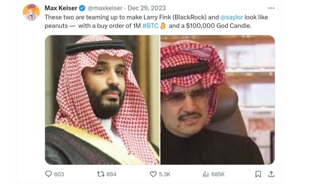 The speculation originated from Bitcoin advocate Max Keiser. He tweeted that the purchase of 1M BTC by Saudi and Qatari investors could dwarf prior big buys from Wall Street institutions like BlackRock and MicroStrategy.