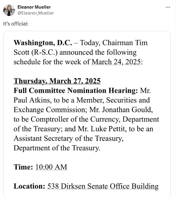 “Donald Trump’s pick for SEC chair Paul Atkins will face the Senate Banking Committie next Thursday for his nomination hearing.”